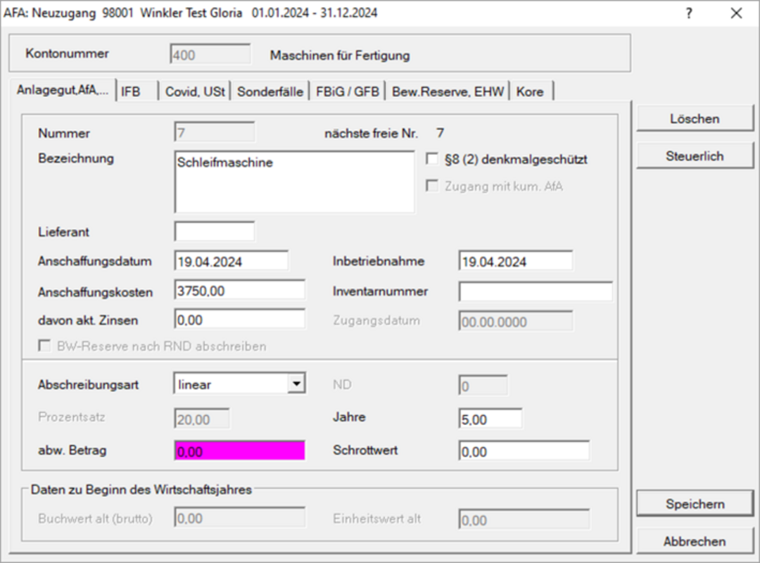 - Wahlweise lineare, degressive, beschleunigte oder betragsmäßige AFA