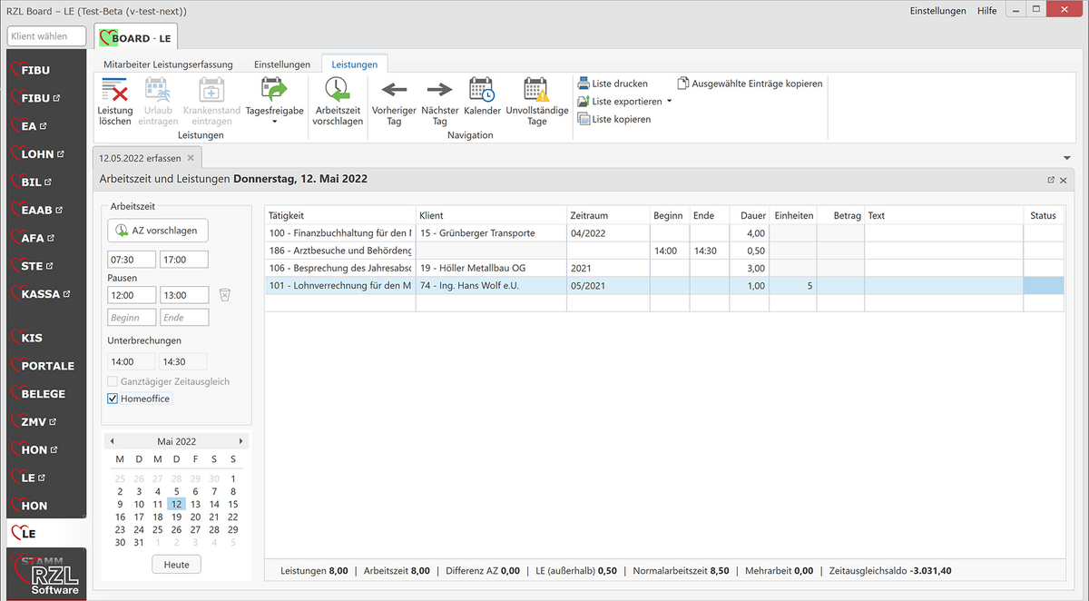 Mit der in der RZL HON Next integrierten Leistungserfassung Next können Sie und Ihre Mitarbeitenden die für Ihre Klienten erbrachten Leistungen erfassen und damit gleichzeitig die Arbeitszeitaufzeichnungen gemäß Arbeitszeitgesetz vornehmen. Aus diesen Leistungen werden im Verrechnungsbereich automatisiert Honorarnoten-Vorschläge generiert, aus denen zügig die fertigen Honorarnoten erstellt werden können.
