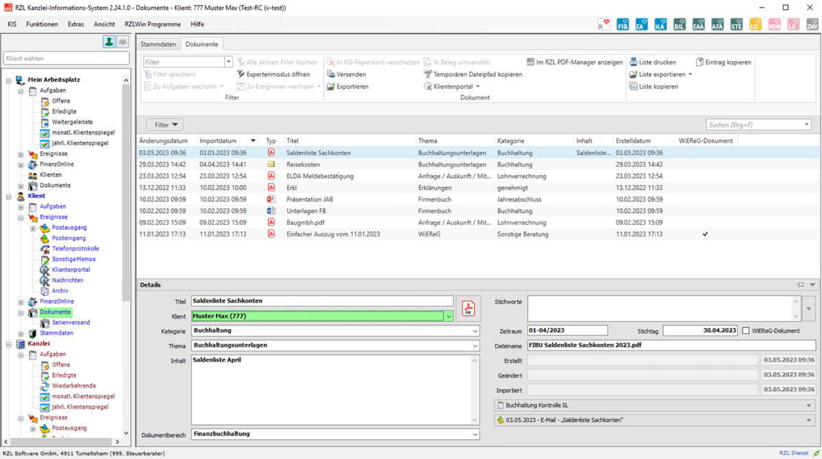 Mit der RZL KIS Dokumentenverwaltung können Sie digitale Dokumente klientenbezogen im RZL KIS speichern und diese jederzeit wieder aufrufen. Beispielsweise können alle über den RZL PDF-Manager erstellten Auswertungen aus den RZL Programmen direkt im RZL KIS beim Klienten abgelegt und jederzeit wieder eingesehen werden. Gleiches gilt – in Kombination mit der RZL KIS Korrespondenz-Verwaltung – für die E-Mail-Korrespondenz bzw. für andere digitale Dokumente (Word, Excel, PDF, usw.). Alle Dokumente können beschlagwortet bzw. nach verschiedenen Kriterien gefiltert und sortiert werden.