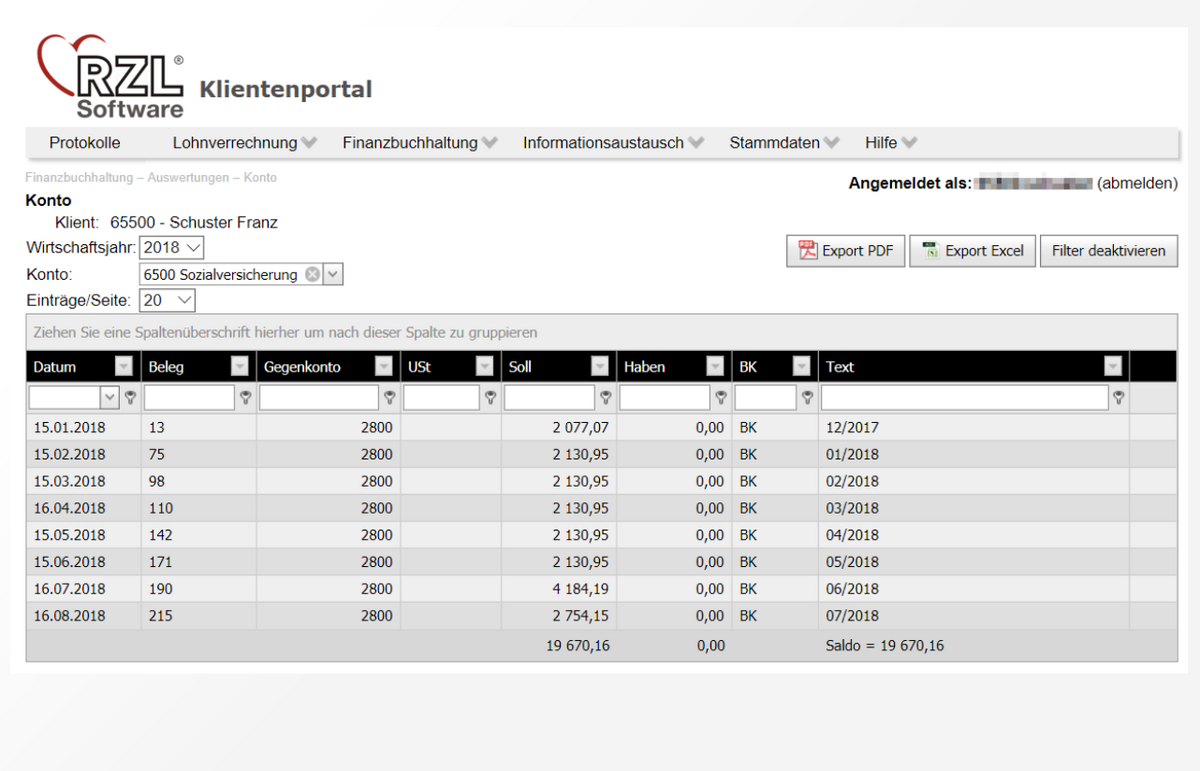 Über das RZL Klientenportal Modul FIBU-/EA-Auswertungen ist für den Klienten - nach Freigabe durch die Kanzlei - der Zugriff auf verschiedenste Buchhaltungs- EA-Daten (derzeit: Saldenliste, Journal, Konten) möglich. Bei Nutzung der RZL Belegverarbeitung kann natürlich auch der mit der Buchung verknüpfte Beleg direkt am jeweiligen Konto aufgerufen werden.