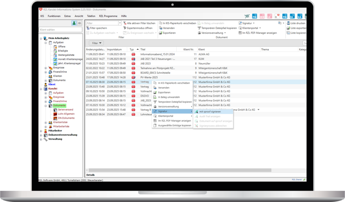 RZL Sign ist eine in das RZL KIS integrierte Lösung für effizientes und rechtsgültiges Signieren digitaler Dokumente. Wir bieten Ihnen das Modul RZL Sign in Kooperation mit unserem österreichischen Partner, Firma sproof GmbH, an.