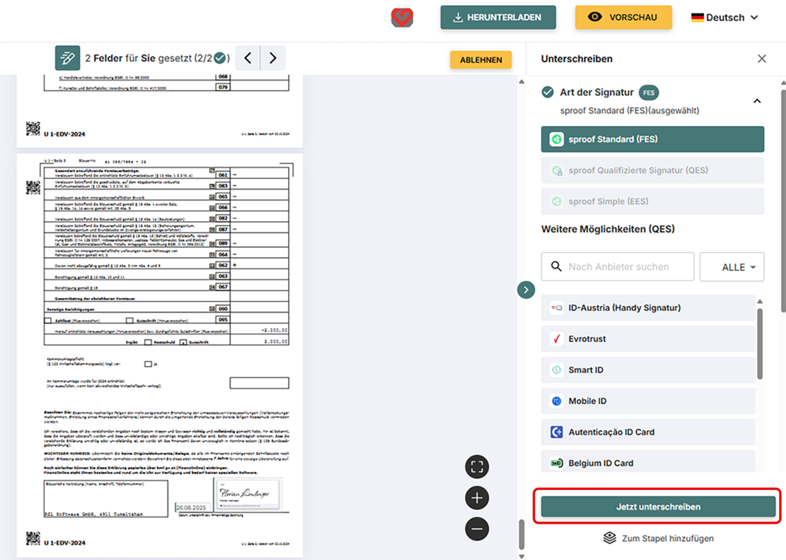 In den Steuererklärungsformularen sind die Platzhalter für die digitale Signatur bereits enthalten und müssen in sproof nicht mehr manuell platziert werden.