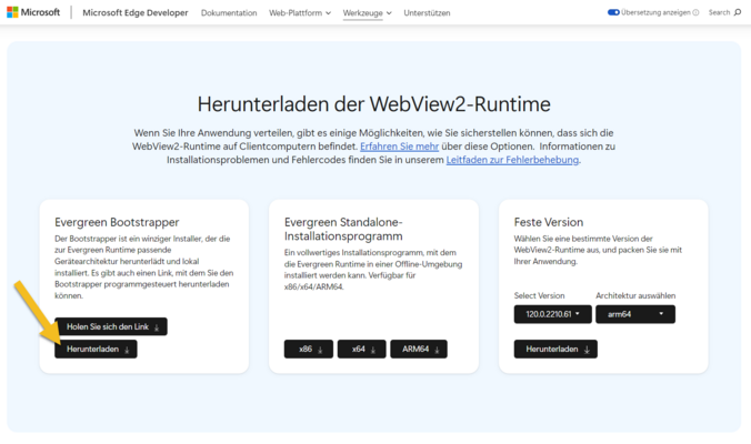 Öffnen Sie die Seite https://developer.microsoft.com/de-de/microsoft-edge/webview2/#download-section. Klicken Sie dort auf Herunterladen und führen Sie die Anweisungen zum Installieren der WebView2 Runtime aus.