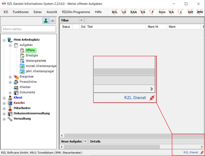 Der RZL-Dienst wird derzeit nicht mehr ausgeführt. Ein Ausfall führt zu vorübergehendem Funktionsverlust von Programmen und Modulen, die auf den RZL-Dienst angewiesen sind (z. B. Hon Next, Fibu Next, Dokumentenverwaltung Plus, KIS Schnittstelle Scanner Anbindung).